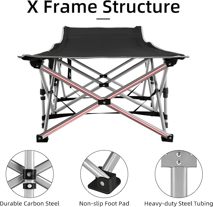 - Durable Structure & 600 Lbs Max Load: Fragess camp cot is constructed in a triangular shape and thicker steel. Each heavy duty cot leg has non-slip pads to ensure safety and stability. Folding camping cot can withstand 600 lbs, won't squeak or shake when you sleep, ideal sleeping cots for adults. Cot size:75 x 28 x 13.8 inch
