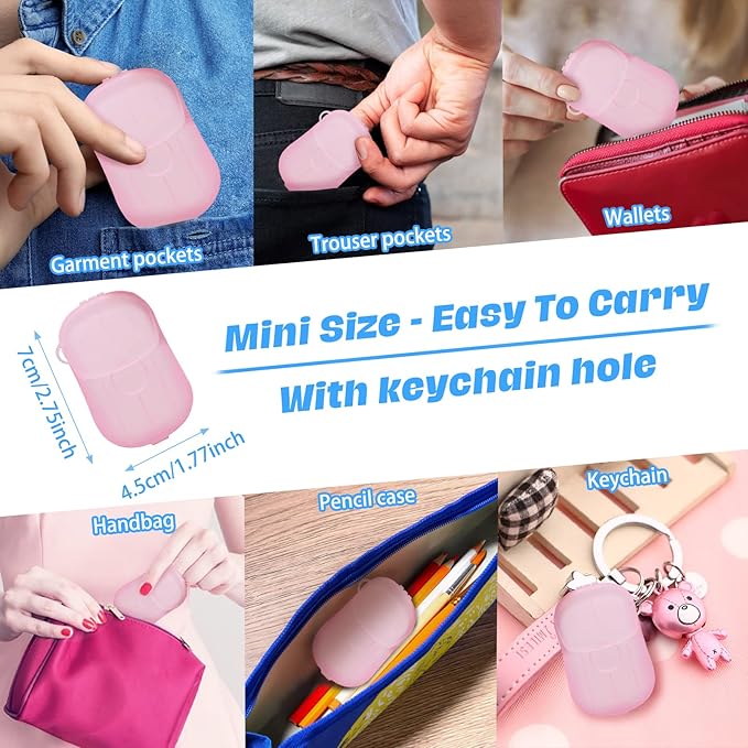 - 【Small size】7*4.5cm/2.75*1.77inch, perfect for any bag or pocket, doesn't take up too much space and is very practical. The box has holes on the side for hanging on keychain for easy carrying. The opening has a sealing clasp design to ensure that the portable soap tablet does not fall off and is water and dust resistant. The box is strong and durable, not easily broken and reusable.
