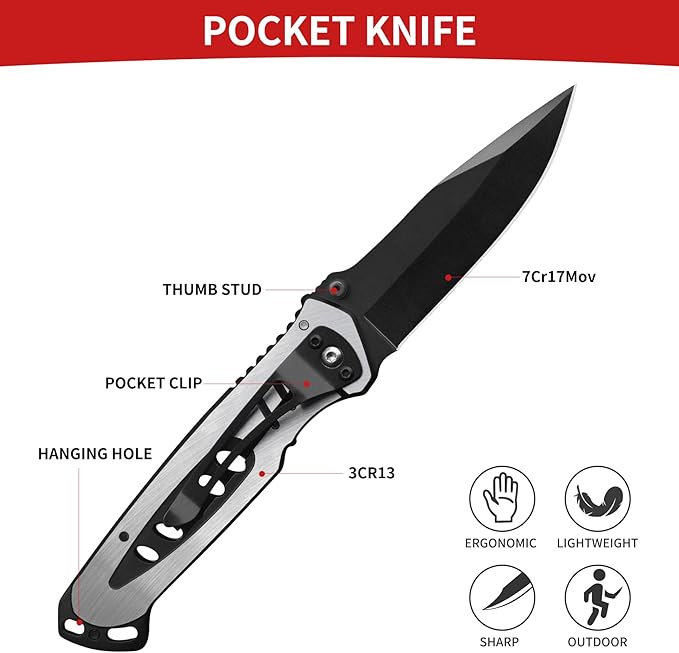 - Multi-Purpose: Pocket knife with a lanyard hole and pocket clip that is convenient to carry. It is suitable for all kinds of outdoor activities and perfect gifts, such as camping, fishing, hiking, outdoor. Surprise your mother, sister, girlfriend. Perfect gift for Birthday, Thanksgiving day. Stocking stuffers for men, women.