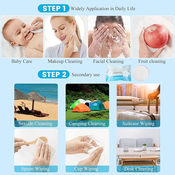 - 【Eco-friendly】: These compressed toilet paper tablets made of non-woven cotton linen, with strong water absorption. Soft to touch skin and comfortable feeling, no rash and discomforts.Totally eco-friendly, use them without fear of damaging the mother nature.