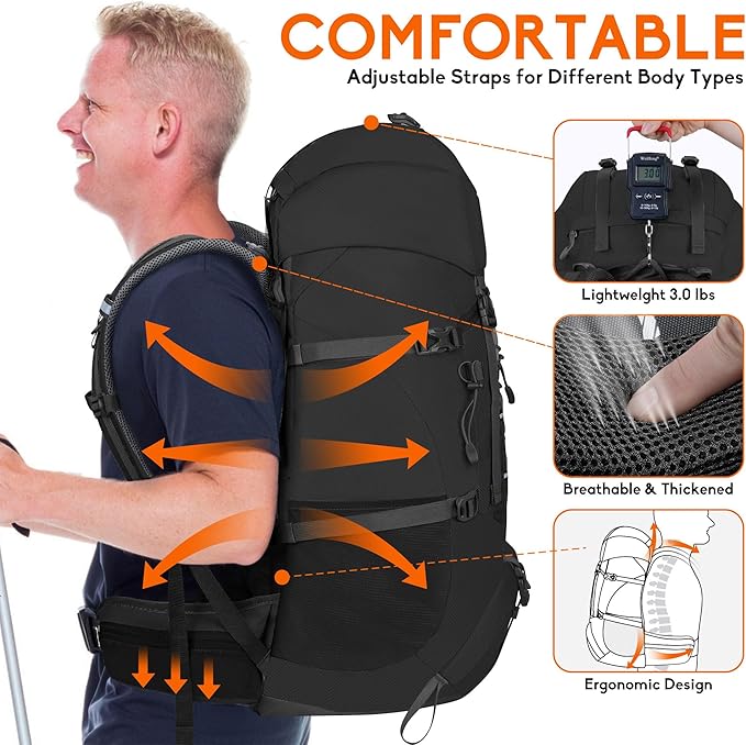 - Waterproof and Durable: Climbing backpack is made of high quality nylon fabric, which is tear resistant, scratch resistant, wear resistant. You can also use our rain cover (our hiking bag comes with a rain cover at the bottom) to further protects your valuables from heavy rain and keeps everything dry