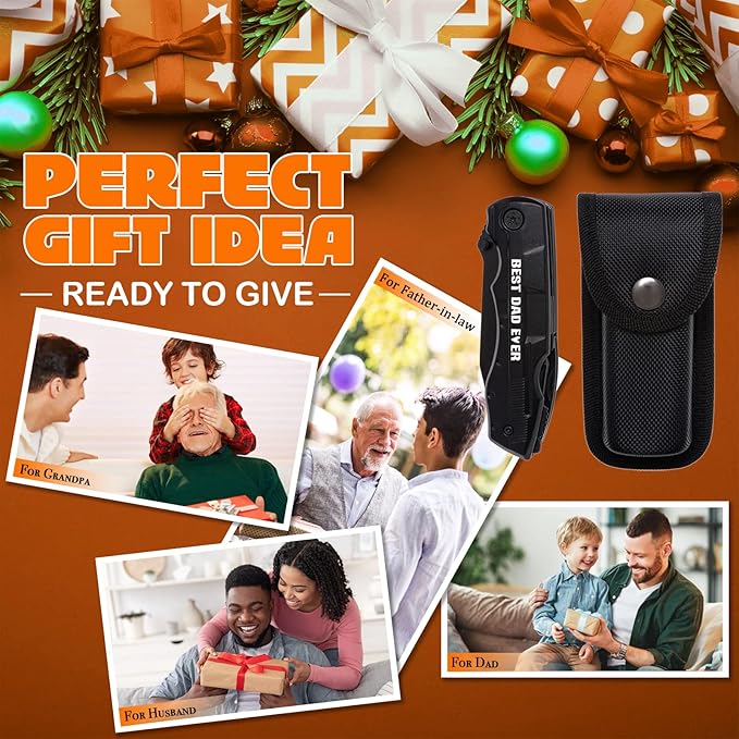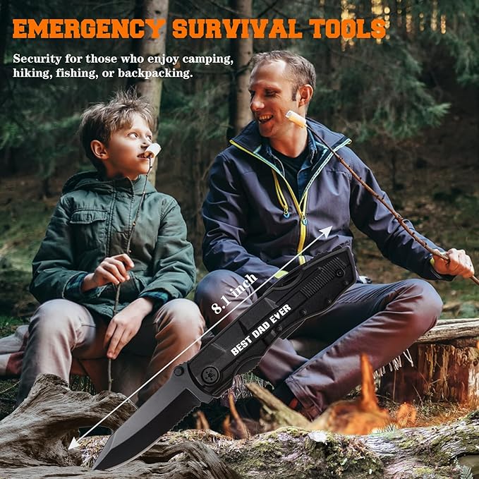 - High-Quality & Unique: The upgraded tactical knife is made of prime 440C stainless steel and aluminum, the special material that makes dad gift higher quality. The surface of the folding knife is finished with a black oxide coating, which provides good rust resistance. The engraved "BEST DAD EVER" passionately expresses deep love for Dad. IT'S A UNIQUE GIFT FOR DAD.