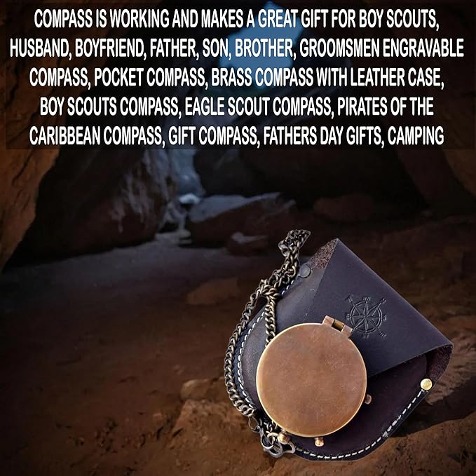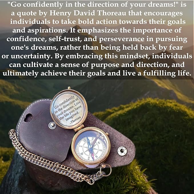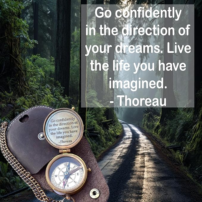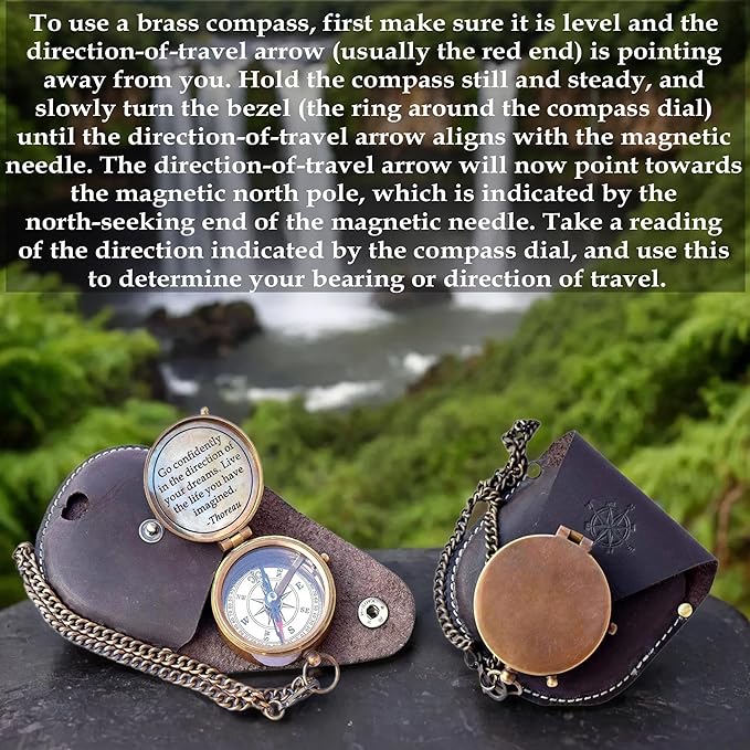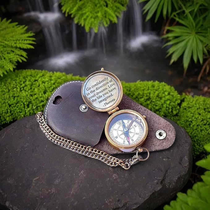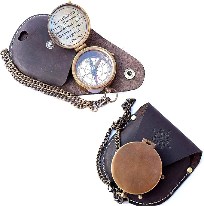 - Personalized Gift Compass: Brass Engraved Compass with Stamped Leather case. Brass Compass "GO CONFIDENTLY IN THE DIRECTION OF YOUR DREAMS LIVE THE LIFE YOU HAVE IMAGINED". Under the glass cover is beautiful, the high-quality jeweled compass needle settles to the North very quickly for timely and accurate readings. It has a small lever on the side of the compass that operates a needle lift mechanism to protect the compass bearing. Gift for someone you love. Engraved message of the Compass.