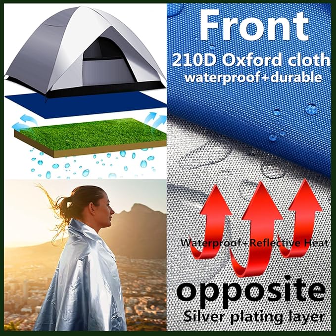 - 1、Upgraded Material: pocket blanket is made of high-quality Oxford cloth for outdoor tents, which is strong, tear-resistant, and scratch-resistant. The bottom is silver-coated, heat-insulated, double-sided waterproof, sand-proof, grass-proof, easy to clean and maintain. Simply wipe or shake off any debris with a damp cloth. Easy to clean and maintain, foldable beach blanket suitable for different environmental grounds such as sandy beaches, grasslands, and mountains.