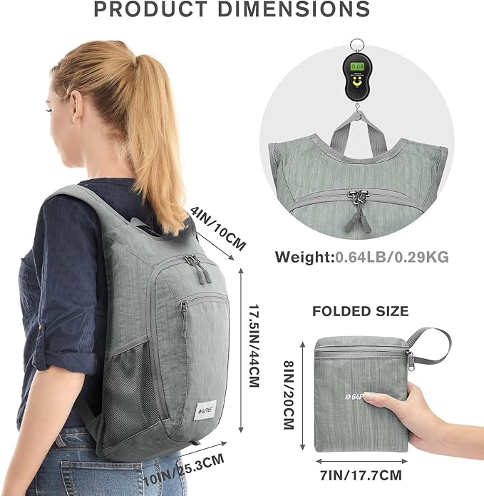 - FOLDABLE: This backpack is easy to fold up into its pocket (Not included an extra pouch. Just its own inner pocket to pack with. ) Unfold size: 17.5x10x4 inches. Folded size only 8 x 7 inches, easily pack it in your suitcase, backpack, or car and simply unfold from your checked bags and use it as a carry-on for your excess baggage to avoid the overweight charge.