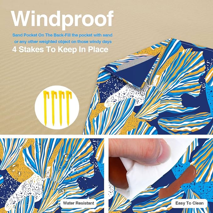 - 🌊4 × Sand Pockets & 4 × Anchor Stakes: The beach mat is equipped with 4 fixed anchors stakes and 4 triangle sand pockets at the corners of the beach mat which you can put some stones or sand into, so you don't have to worry about the beach mat being disturbed by wind and sand, and can enjoy your day at the beach.