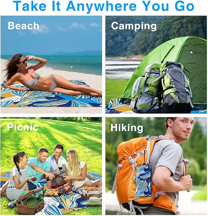 - 🌊Waterproof and Non-sticky Sand: Beach Blanket is made of 210T polyester fiber, which can effectively prevent water and cracks from damaging it. Non-stick sand: Shake the beach mat gently to get rid of sand or other debris easily. Effectively prevent sand from sticking to the mat. The beach blanket can be washed in washing machine.