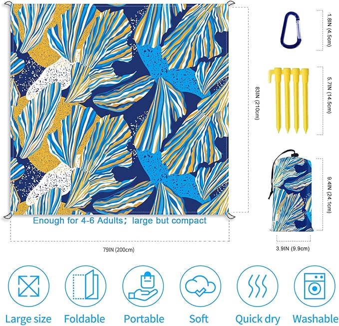 - 🌊Oversized But Compact: The 79"× 83" size beach / picnic blanket comfortably fit 4-6 adults sitting or 4 adults lying. It is the best choice for family and friends gathering. And it is easy to fold into a compact size(7.87"x3.93"), 0.73 lbs, so you can easily carry it for anywhere!