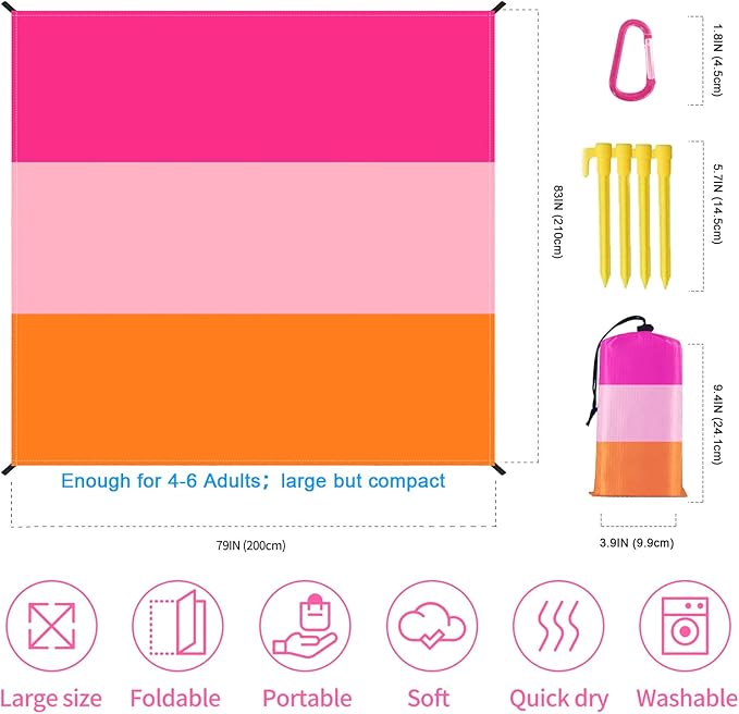 - 🌊Oversized But Compact: The 79"× 83" size beach / picnic blanket comfortably fit 4-6 adults sitting or 4 adults lying. It is the best choice for family and friends gathering. And it is easy to fold into a compact size(7.87"x3.93"), 0.73 lbs, so you can easily carry it for anywhere!