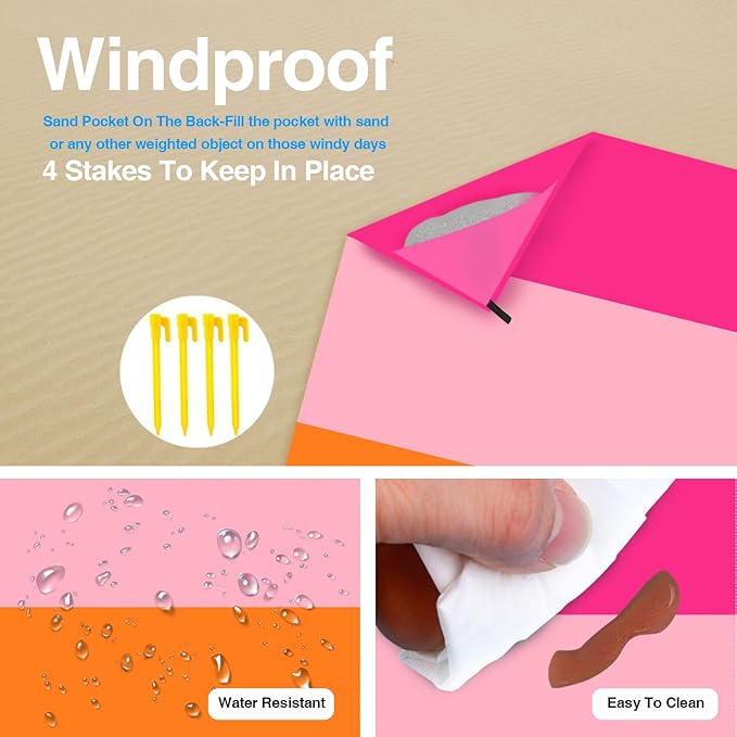 - 🌊4 × Sand Pockets & 4 × Anchor Stakes: The beach mat is equipped with 4 fixed anchors stakes and 4 triangle sand pockets at the corners of the beach mat which you can put some stones or sand into, so you don't have to worry about the beach mat being disturbed by wind and sand, and can enjoy your day at the beach.