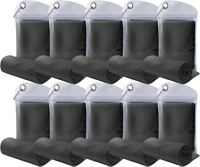 10 Pack Cooling Towel Bulk Microfiber Ice Towel Quick Dry Breathable Chilly Sweat Towel Stay Cool Towel for Neck Face Yoga Gym Workout Running Pilates Beach with Carabin Bag, 40x12'',Dark Grey