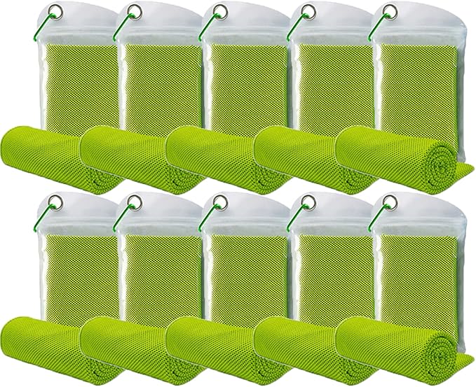10 Pack Cooling Towels Bulk Microfiber Ice Towel Quick Dry Breathable Chilly Sweat Towel Stay Cool Towel for Neck Face Yoga Gym Workout Running Pilates Beach with Carabin Bag, 40x12'', Green