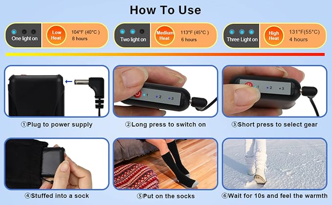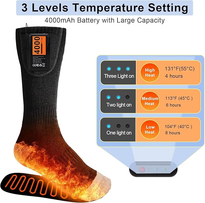 - 🌡️【3 Heating Levels】: The winter socks have 3 levels setting heat controller, you can easily adjust the comfortable temperature. Long press the switch (2~3s) to turn on/off, short press the button to switch the temperature setting. Including high heat (55⁰C/131⁰F, 4 hours ,3 indicator lights on), medium heat (45⁰C/113⁰F, 6 hours,2 indicator lights on), and low heat (40⁰C/104⁰F, 8 hours).