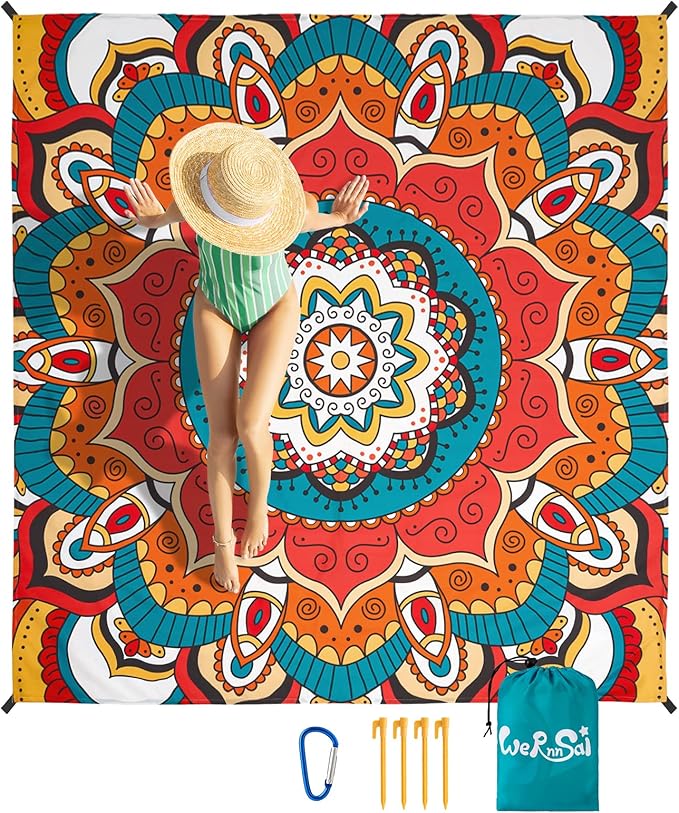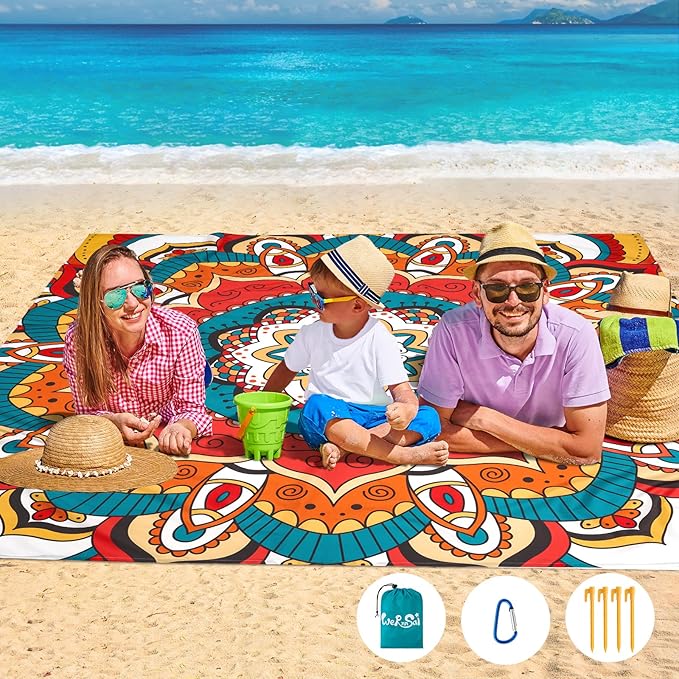 WERNNSAI Beach Blanket - Beach Mat Mandala Beach Blanket 83’’ x 79’’/ 6.5Ft x 7 Ft Waterproof Sandproof Oversized Lightweight Picnic Mat for Adults Outdoor Beach Party Travel Camping Music Festival