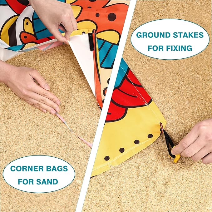 - EASY TO USE & STORE: Simply use ground stakes and 4 corner pockets with sand to hold the blanket in place, which can be inserted deeper into the beach or soil. The beach blanket weighs only 0.4kg, it can be folded very small and easily to carry. After use, you can store it in the storage bag we provide.
