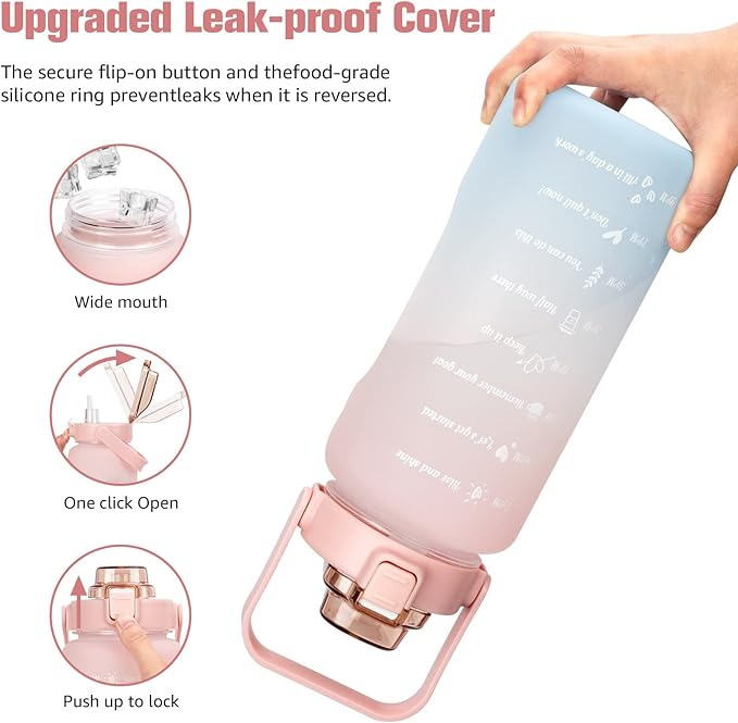 - LEAKPROOF & POP-UP STRAW: Latest pop up lid with silicone O-ring, secure lock & dust cover, half gallon water bottle with sleeve ensures leak proof & dust proof. Advanced button design makes you drink more convenient, Just push the button and straw pops out automatically. Pop-up straw in 2L water bottle is removable & detachable, you’ll enjoy spill-proof sipping with straw or fast water flow without straw. 3" Wide-mouth opening is easy to fill with ice cubes and clean.