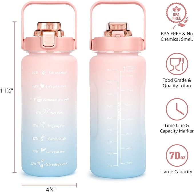 - PERFECT HALF GALLON WATER BOTTLE: The motivational water bottles 1/2 gallon with straw, holding 64oz water, meet your everyday hydration needs with just one jug a day, which is just what health advisors suggest for the average individual to drink pday. The 64oz water bottle is great for measuring your daily intake of water and helps you stay hydrated and drink enough throughout the day.Perfect for gym-goers, runners, hikers, and anyone who needs to stay hydrated throughout the day.