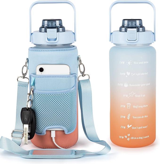 - UNIQUE STORAGE SLEEVE : Half gallon water bottle insulated sleeve stores your stuff easily! Working great in absorbing messy sweat to avoid dripping on the table or seats.These insulated sleeves also help to keep water cold longer and protect the water jug from slight bumps. Water jug with straw has a unique design that holds your cards and a cell phone of any size, and is finished with an in-built key chain and removable shoulder strap for convenient hands free carrying!