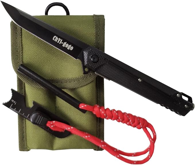 - Products include 1 set of flint fire rod,1 folding knife,1 small hanging bag.