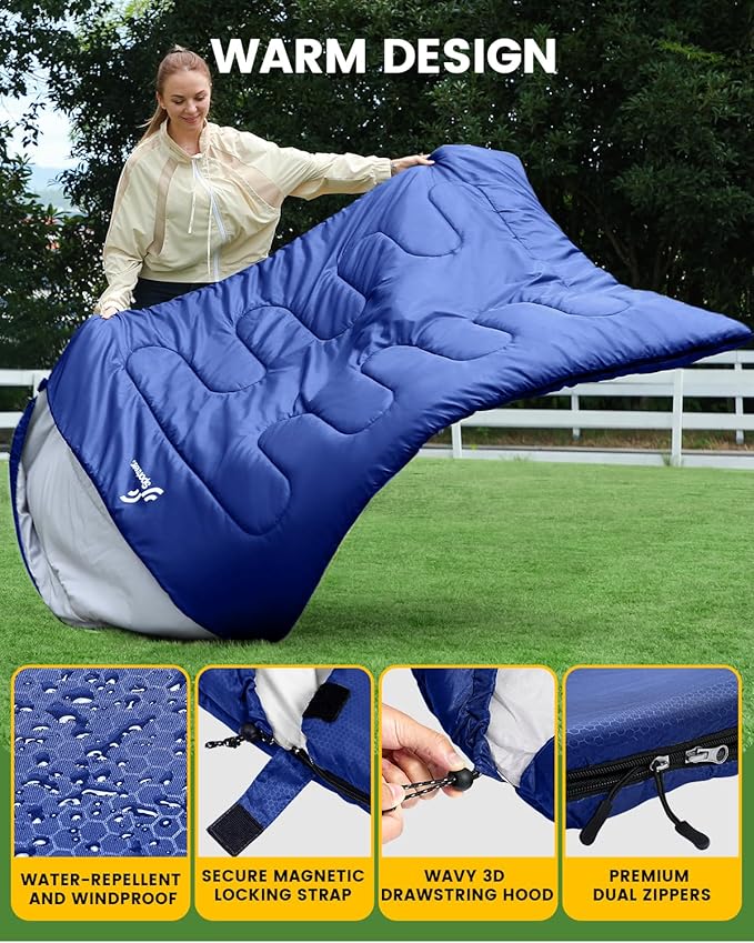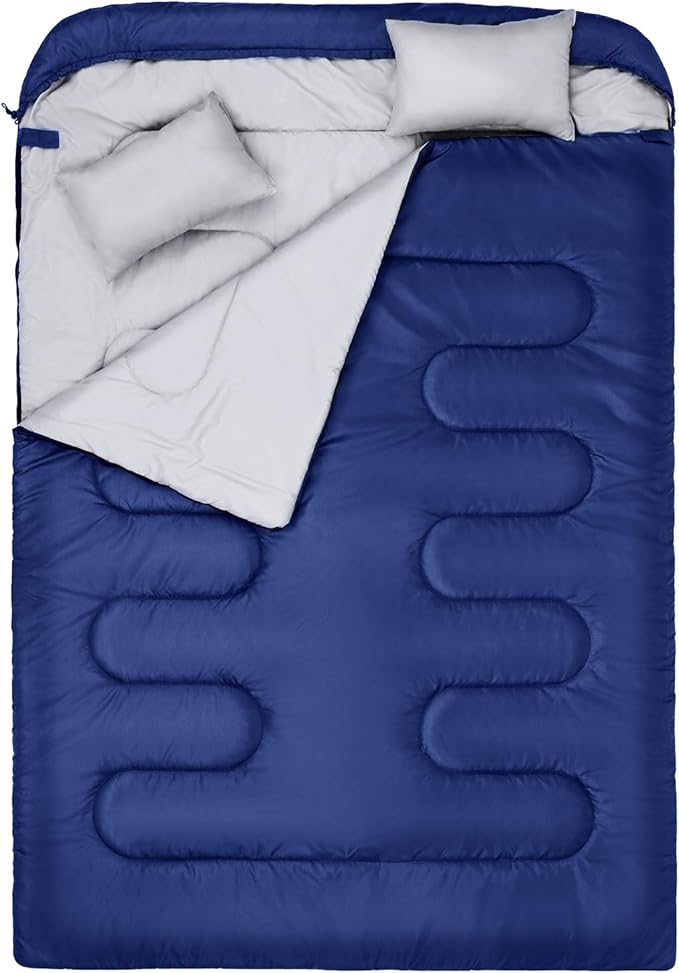 - Versatile Camping Sleeping Bag: Our double sleeping bag features a wrap-around zipper design with two pillows, providing warmth and comfort for a variety of scenarios, also enabling you to split the sleeping bag into two separate single sleeping bag or two queen-sized blankets. Whether camping, hiking, or traveling, our adults sleeping bag is a camping essential for outdoor enthusiasts and travelers. Buy this 2 in 1 double sleeping bag, be close to the nature world!