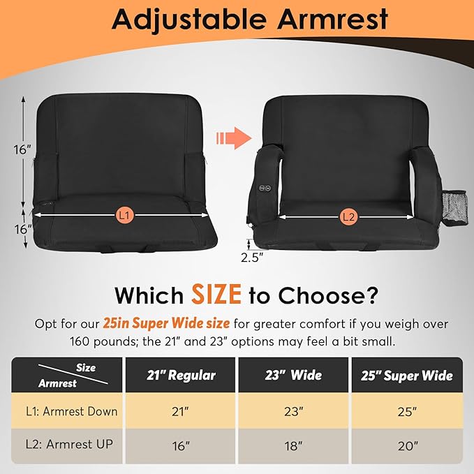 - ๐๐ง๐ฆ๐๐ญ๐๐ก๐๐ ๐๐จ๐ฆ๐๐จ๐ซ๐ญ: Our heated bleacher seats are designed to provide exceptional comfort and support during your stadium experience. Heated folding stadium seats also feature the reclining property. With 6 different reclining adjustments, allowing you to choose according to your needs. The armrests are also adjustable. A very comfortable 18" (arm up) or an extra roomy 23" (arm down).If you weigh over 160 lbs, we recommend choosing our 25" stadium seat from the drop-down menu.