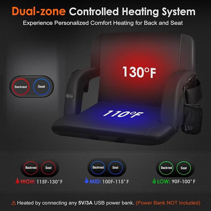 - ๐๐ฎ๐ฌ๐ญ๐จ๐ฆ๐ข๐ณ๐๐ ๐๐จ๐ฆ๐๐จ๐ซ๐ญ: Our heated stadium seats for bleachers with Newest Dual-zone Controlled Heating System, it allows you to adjust the temperature of the backrest and seat cushion independently, offering flexibility and energy efficiency. Experience hours of soothing heat using a USB power bank and stay cozy even in chilly weather. Choose from 3 heat levels (high, mid, low) and reach a max temp of 130ยฐF. Please NOTE: Power Bank NOT included.