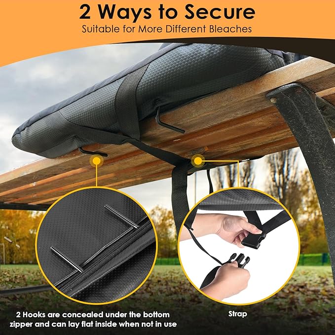 - 2 ๐๐๐ฒ๐ฌ ๐ญ๐จ ๐๐๐๐ฎ๐ซ๐: We offer two options to secure the stadium chair: the bottom fastening strap and 2 sturdy hooks located below the bottom zipper. Seat stability is ensured and movement is minimized to ensure a safe and reliable seating experience. Say goodbye to any concerns about your seat slipping off the bleachers when you leap up to cheer for your team or children.
