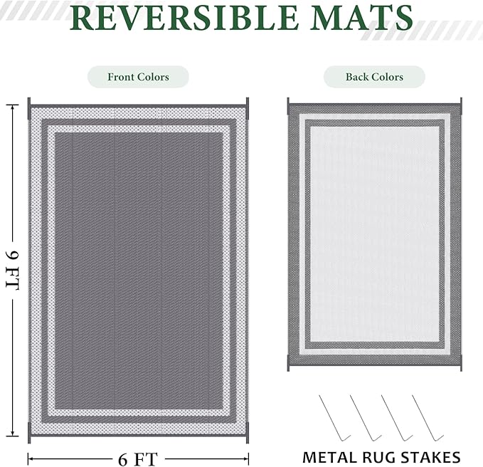 HappyTrends,Outdoor Rug,Patio Rug,Reversible Portable Plastic Straw Rug,Camping Rugs for Outside RV,Large Waterproof Area Rugs for Patio,Deck,Picnic,Porch,Balcony(6'x 9',White&Gray)