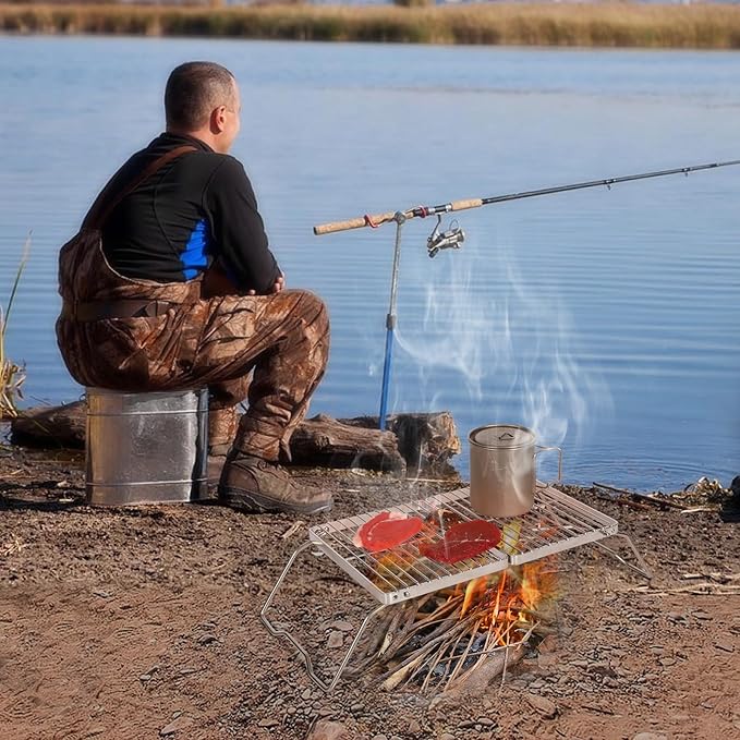 - 【Foldable Design】The folding campfire grill's legs can angle out for stability and help to take the weight. It also can be folded in half from the middle for easy transportation and storage, perfect for your travel.