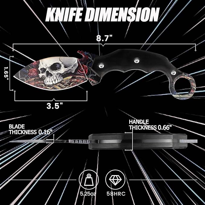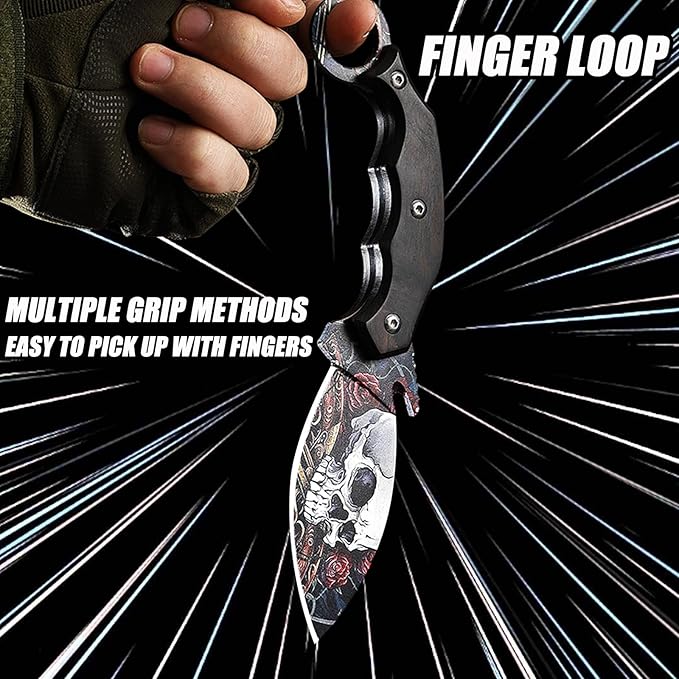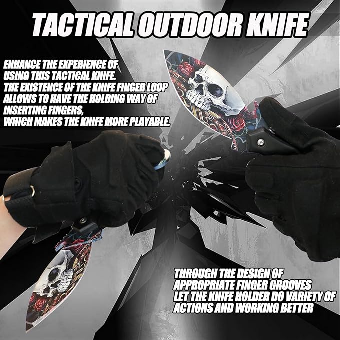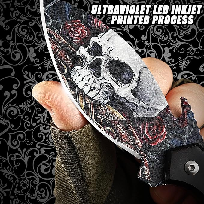 - [Surface SKull Print] Exquisite high-definition patterns about Skull&Rose are printed on the surface of the knife by Ultraviolet LED Inkjet Printer process. The pattern printed on the knife face is very wear-resistant and not easy to fall off, discoloration, the distinctive knife face makes you the most eye-catching person.