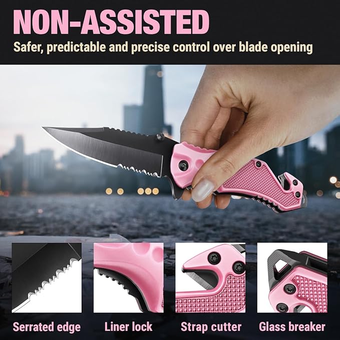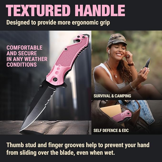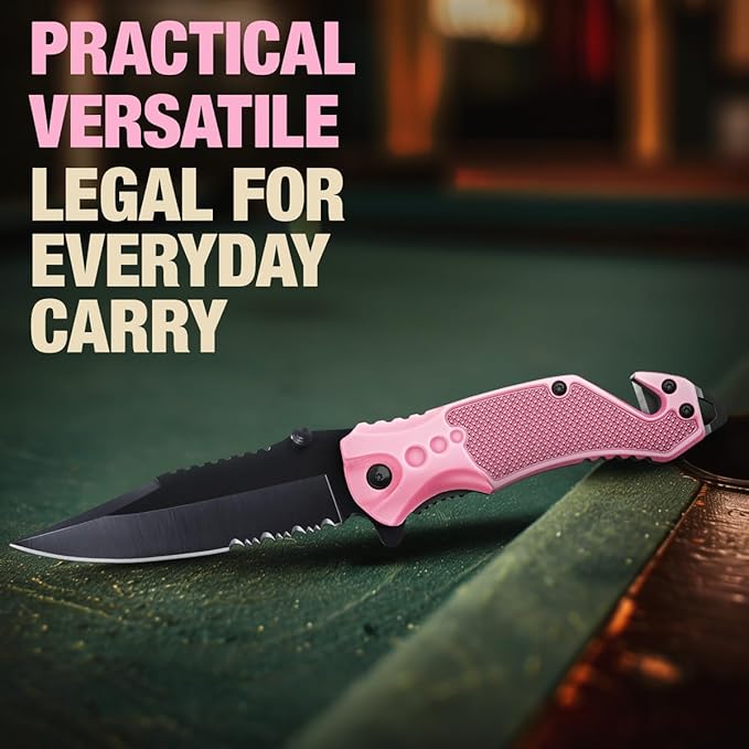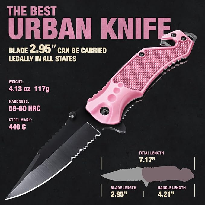 - Cool design. 5-in-1 tactical folding knife equipped with a serrated blade, strap cutter, glass breaker, pocket clip, and lanyard hole. This common pocket knife is legal to carry in all states of the United States. Pink pocket knife for women is made of high quality stainless steel 440C, aluminum ergonomic handle. Lock type - liner lock. Blade length - 2.95”; Handle length - 4.2”; Overall length - 7.17”; Weight - 4.12 oz. Pocket knives & folding knives for women.