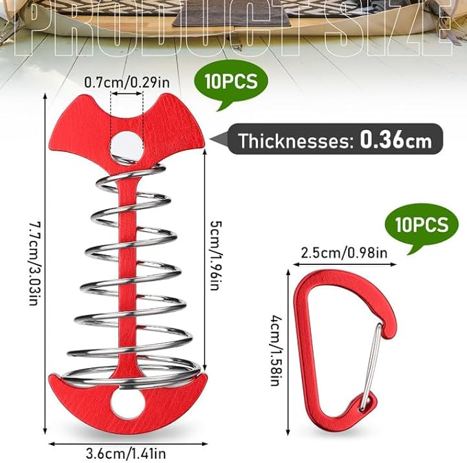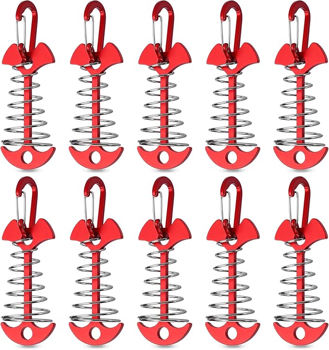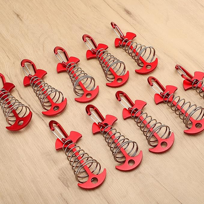 TOBWOLF 10PCS Red Deck Anchor Pegs with Carabiners, Windproof Aluminum Deck Tie Down Spring Tent Stakes, Camping Outdoor Fishbone Tent Anchors Tent Rope Tensioner Guyline Cord Adjuster Tent Pegs