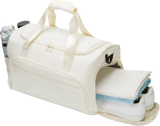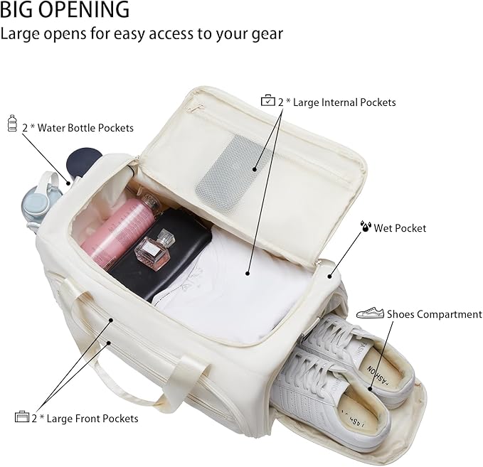 - MULTI POCKETS: This womens gym bag divided into 3 sections, The main compartment with 2 large zip pockets; 2 zip front pockets and 2 water bottle pockets; 1 dedicated shoe compartment and 1 wet pocket; Suitable for carrying your sports items, dirty laundry, shoes, & even toiletries!