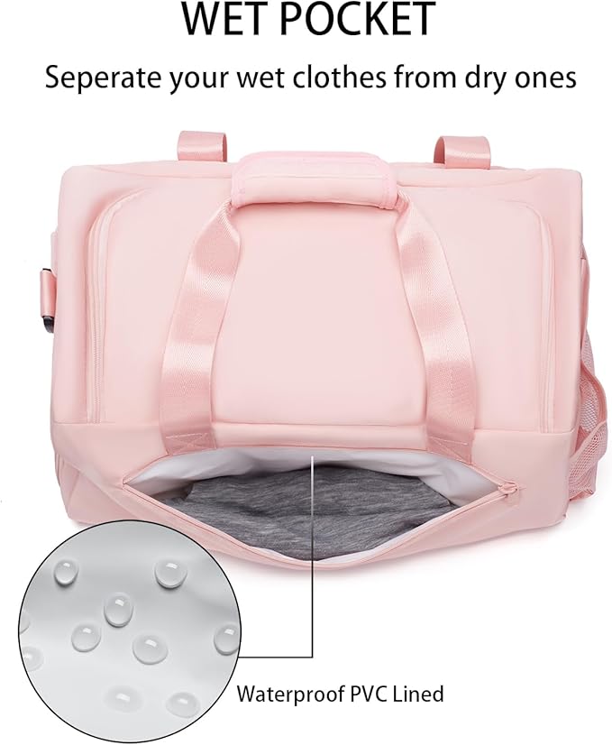 • MULTI POCKETS: This womens gym bag divided into 3 sections, The main compartment with 2 large zip pockets; 2 zip front pockets and 2 water bottle pockets; 1 dedicated shoe compartment and 1 wet pocket; Suitable for carrying your sports items, dirty laundry, shoes, & even toiletries!