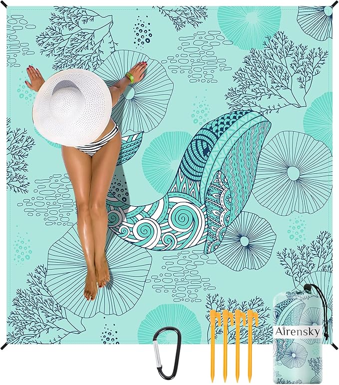 Airensky Beach Blanket Sandproof, Oversized Beach Mat 79" X 82" for 4-7 Adults, Waterproof Beach Blanket Quick Drying Lightweight Blanket with 4 Stakes for Outdoor Travel Camping Hiking(Green Whales)