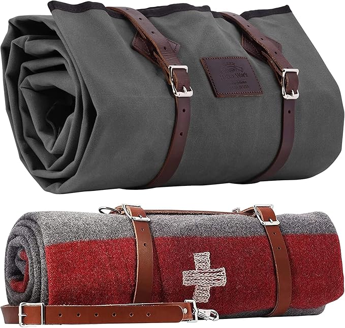 1844 Helko Werk Germany Waxed Canvas Bedroll & Swiss Army Blanket Bundle - Camping Bedroll with Leather Straps and Zipper - Waterproof Waxed Canvas Portable Bed (Slate Gray) #F8761SGB