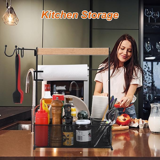- CONVENIENT AND SPACIOUS - The extra large capacity grill caddy is a must-have for anyone who enjoys outdoor activities such as camping, grilling, picnics, and more. With 7 compartments, a paper towel roll holder, and 3 hanging hooks, it can easily hold all of your barbecue accessories, picnic supplies, camping gear, tailgating accessories, and cleaning products, making your travel much easier.e to your outdoor table eating area!