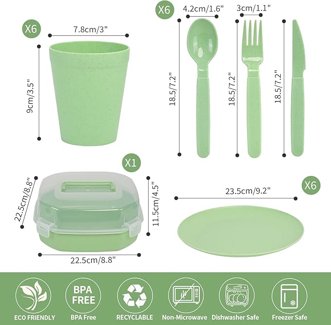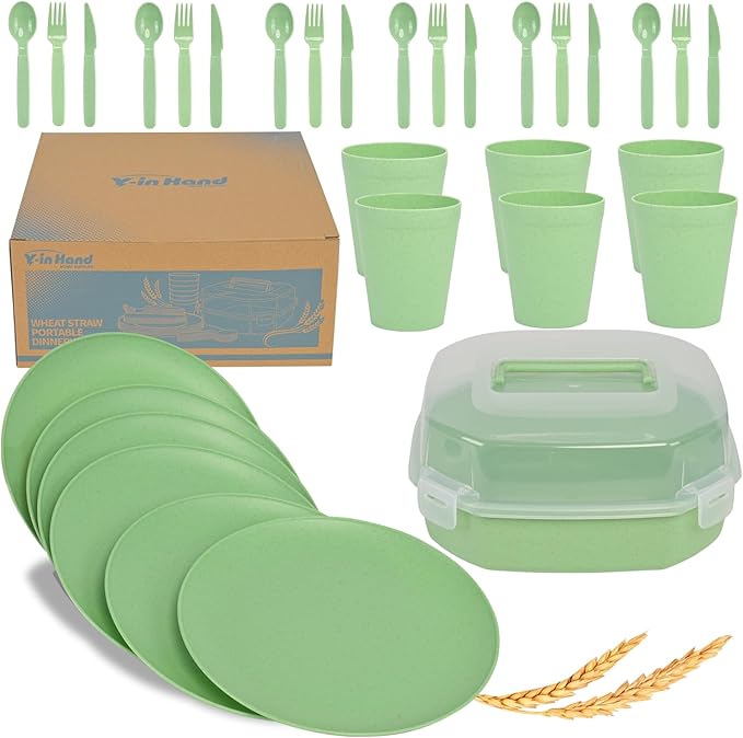 Wheat Straw Dinnerware Sets for 6, 31 Piece Unbreakable Outdoor Cutlery Set. Reusable plates and cups set for camping, picnics, RV trips, and party grills. (Green)