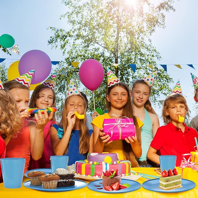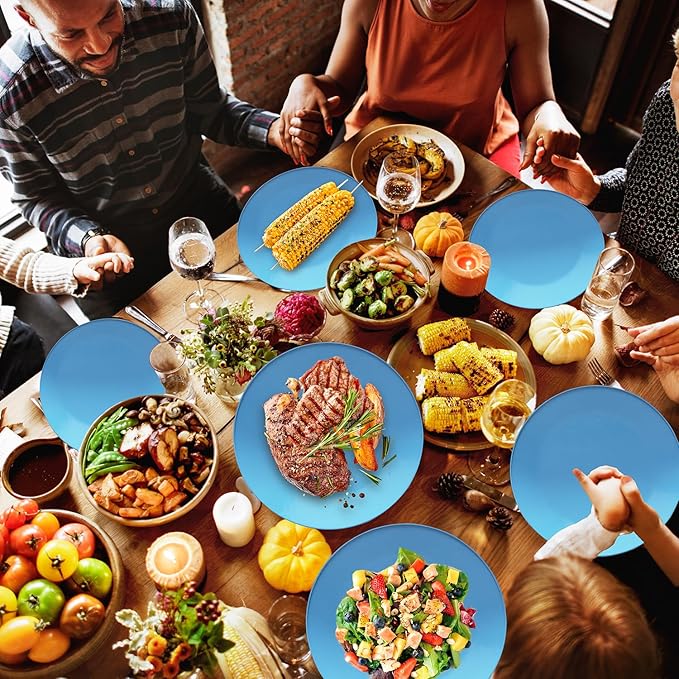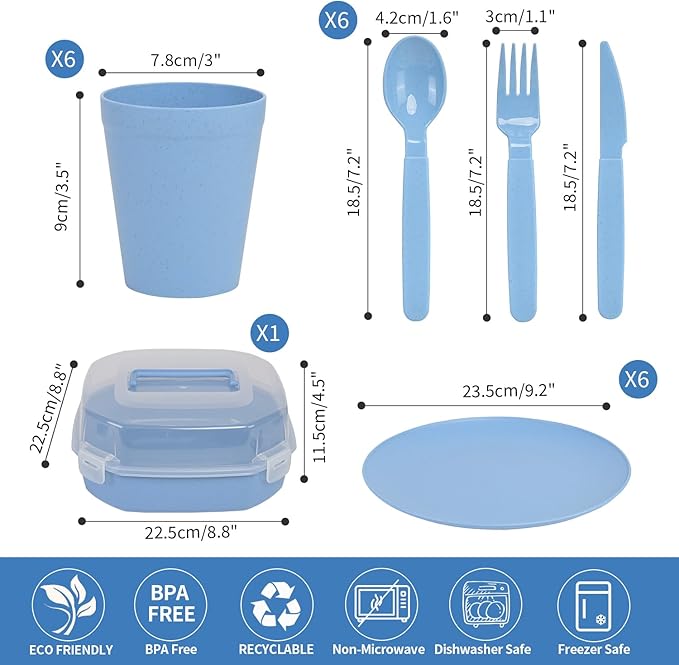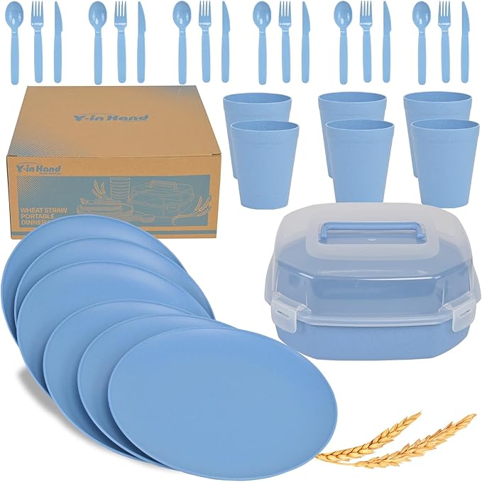 Wheat Straw Dinnerware Sets for 6, 31 Piece Unbreakable Outdoor Cutlery Set. Reusable plates and cups set for camping, picnics, RV trips, and party grills. (Blue)