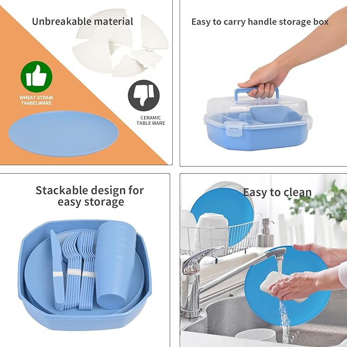 - 🌾【Lightweight & Durable】Compared to ceramic tableware, wheat straw is light and unbreakable, making it more suitable for outdoor use. This set includes a portable cutlery storage box for better storage and portability.(Storage size: 25.5*25.5*11.5cm/10*10*4.5in)