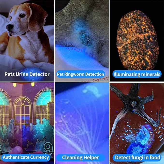 - Rechargeable 365 nm Black Light UV Flashlights can easily find room stains, It can detect fungi in food and check if bills and banknotes have been counterfeited, Can be carried along to detect stains in your car or illuminate minerals, Body art, Finding scorpions.