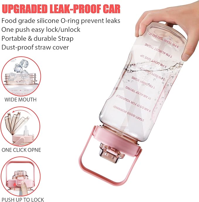- LEAKPROOF & POP-UP STRAW: Latest pop up lid with silicone O-ring, secure lock & dust cover, half gallon water bottle with sleeve ensures leak proof & dust proof. Advanced button design makes you drink more convenient, Just push the button and straw pops out automatically. Pop-up straw in 2L water bottle is removable & detachable, you’ll enjoy spill-proof sipping with straw or fast water flow without straw. 3" Wide-mouth opening is easy to fill with ice cubes and clean.