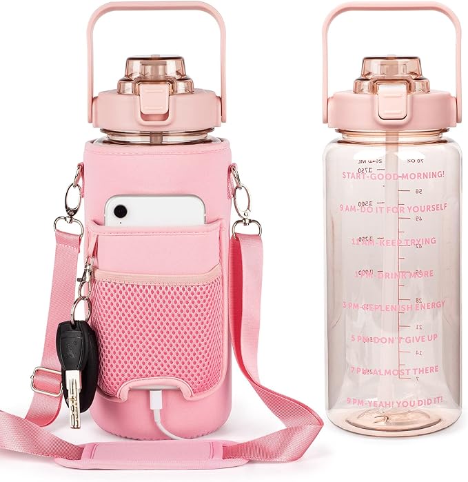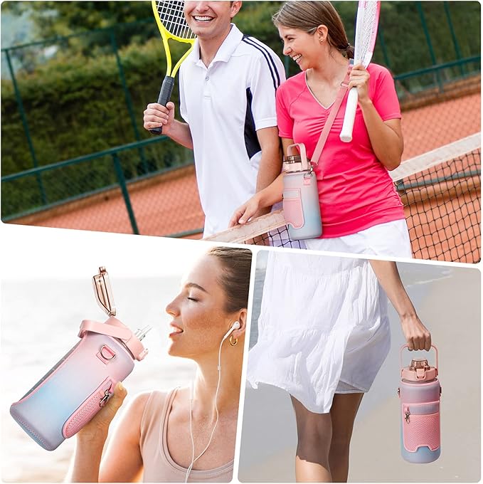 - PERFECT HALF GALLON WATER BOTTLE: The motivational water bottles 1/2 gallon with straw, holding 64oz water, meet your everyday hydration needs with just one jug a day, which is just what health advisors suggest for the average individual to drink pday. The 64oz water bottle is great for measuring your daily intake of water and helps you stay hydrated and drink enough throughout the day.Perfect for gym-goers, runners, hikers, and anyone who needs to stay hydrated throughout the day.