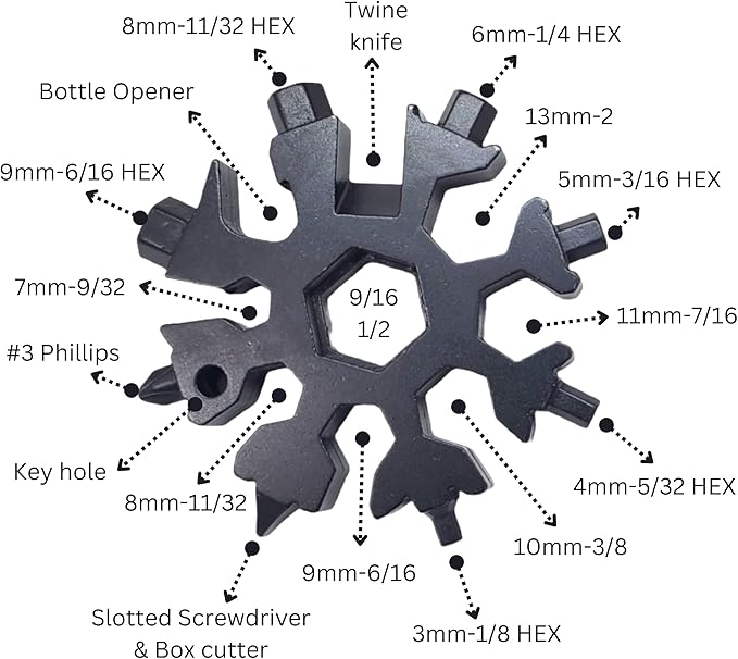 - COMPACT AND PORTABLE: The snowflake-shaped design of this multitool makes it compact and easy to carry around. It fits easily in your pocket, purse, or backpack, making it the perfect tool to take with you wherever you go.