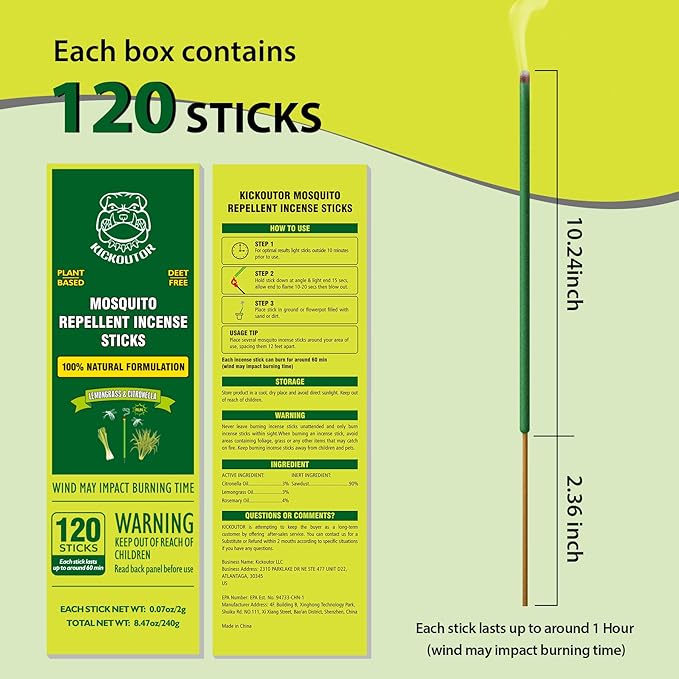 - EFFECTIVE MOSQUITO REPELLENT:KICKOUTOR mosquitoes repellent uses a combination of plant-based repellent oils, which herbal ingredients provide a safe insect repellent effect. Smoke emitted by mosquito sticks will deter buzzing mosquitoes and other bugs itchy bites. Giving you a relaxing atmosphere and keeping you and your family safe from mosquito bites