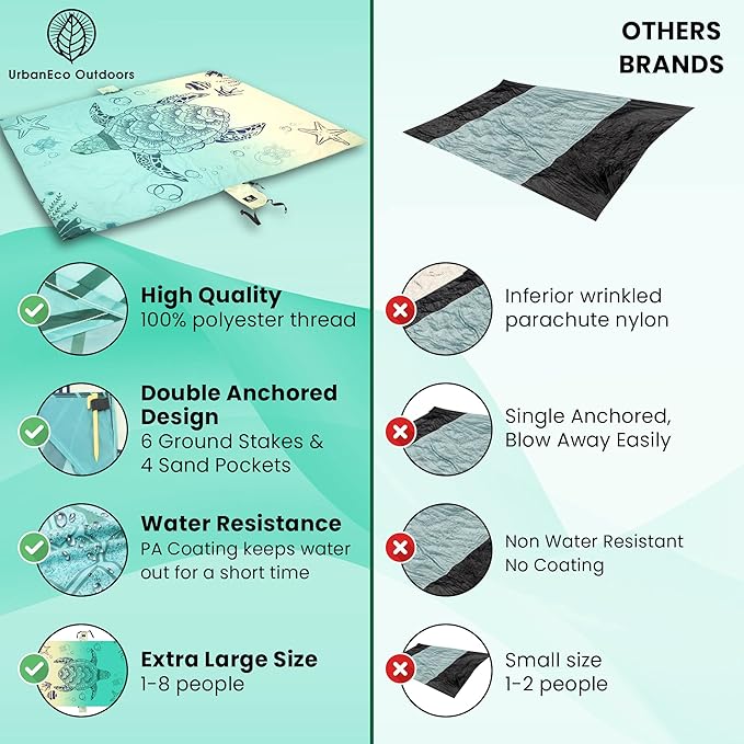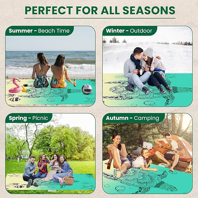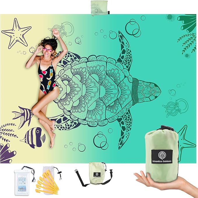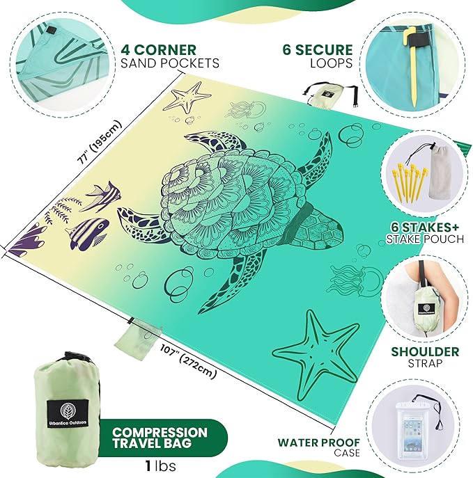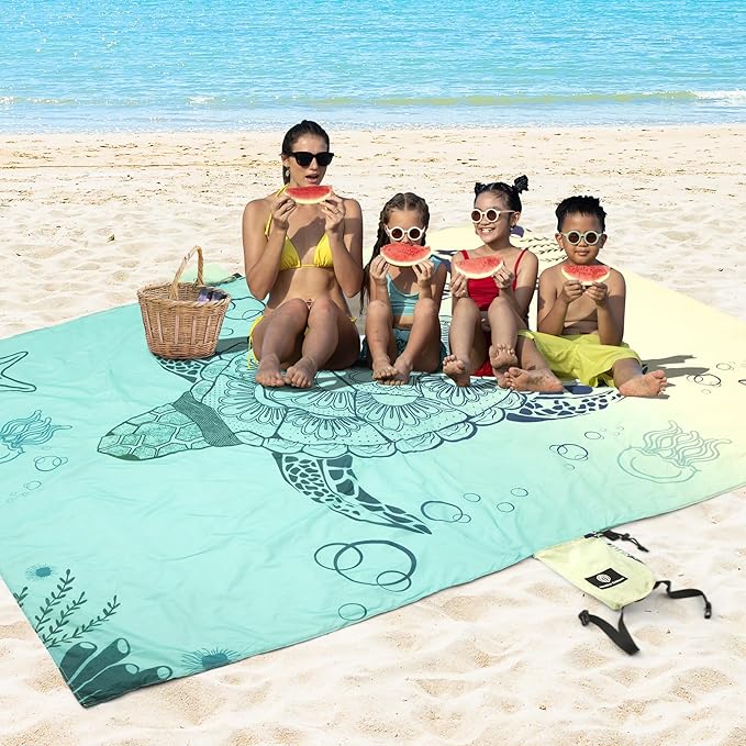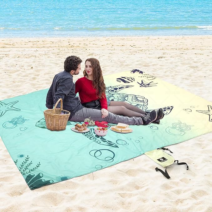 - QUICK DRY BEACH BLANKET SANDPROOF & WATER RESISTANT: This Turtle Designed styled beach blanket keeps you clean and dry in the outdoors. Although it's not 100% waterproof, with a water resistant outdoor blanket like ours, you'll keep water at bay, so you enjoy your day with our water resistance blanket. Our waterproof beach mat is versatile in design. Perfect as an outdoor picnic blanket, sand free beach mat or practical solutions to take to festivals, concerts, hikes and gatherings