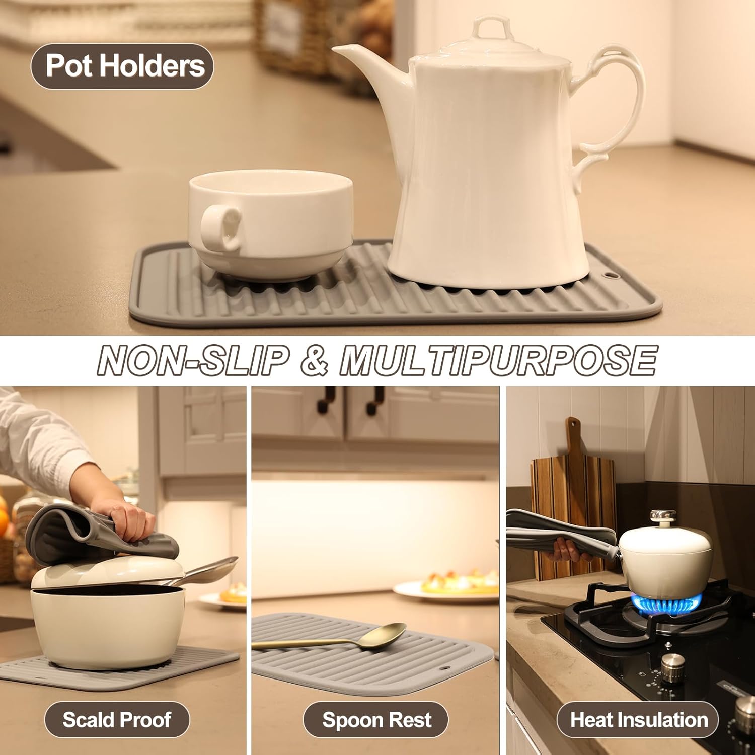 - MULTIPURPOSE KITCHEN TOOLS - Our silicone trivets for hot dishes are non-slip, flexible and soft enough to comfortably grab hot pots and pans, jar opener, drying mat or potholders. Silicone hot pads for kitchen are perfect for use in an oven, microwave, or freezer, protect your hands from hot and cold.