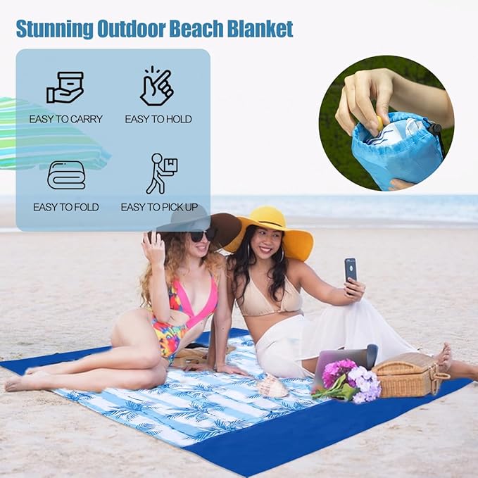 - Easy to Carry and Store - It's an extra large beach blanket, but it's also easy to stow away. Our oversized sand proof beach blanket and thin sheet beach mat rolls into a compact size that fits in its storage sack. It's a thin, lightweight and packable blanket, so you'll have no problem tossing it in the trunk for your next trip! Included storage bag and carrying clip easily attaches to backpacks, purses, and even your pocket.