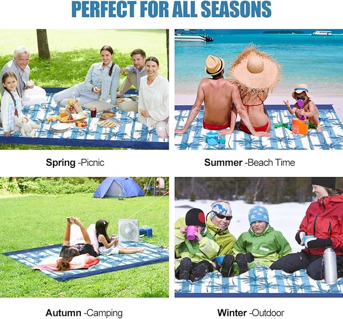 - Multifunctional Mat - This beach blanket performs effectively at picnics, camping, hiking, concerts, football games. Use it as a Beach/Picnic Blanket. It's a truly multifunctional camping accessory.