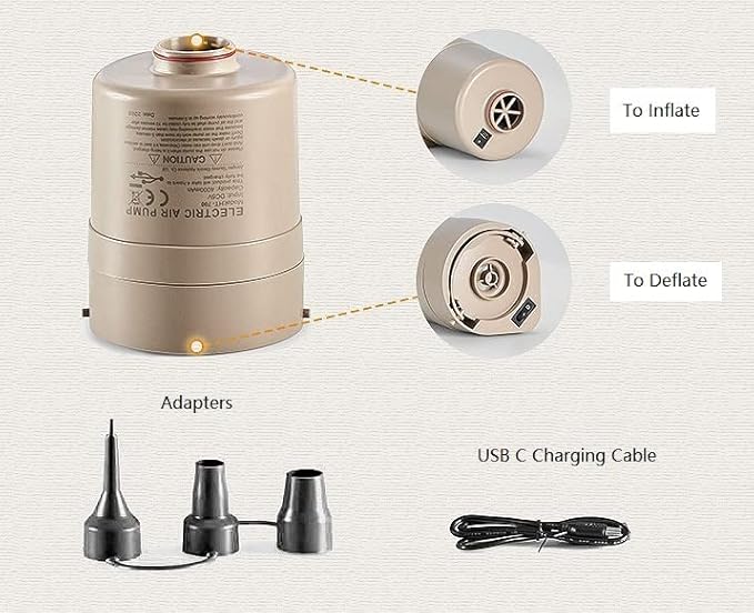 - Fast inflation and detachable multi-use air pump: Automatic inflation/deflation in just 120 seconds, saving time and effort. Includes 3 common air nozzles for inflating/deflating other objects and use as a picnic fire blower. 2000mAh high-capacity battery with USB-C charging provides convenience.